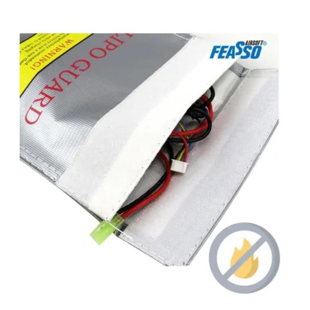 A Lipo Safe Bag da Feasso é um acessório essencial para armazenar e carregar baterias LiPo com segurança. Projetada com material resistente ao fogo, ela minimiza os riscos de incêndio em caso de curto-circuito, sobrecarga ou falha da bateria. Seu uso é simples: basta colocar a bateria dentro da bolsa, fechar com o velcro reforçado e utilizá-la como proteção ao carregar ou armazenar as LiPo. Ideal para praticantes de airsoft, aeromodelismo e outras atividades que utilizam esse tipo de bateria.