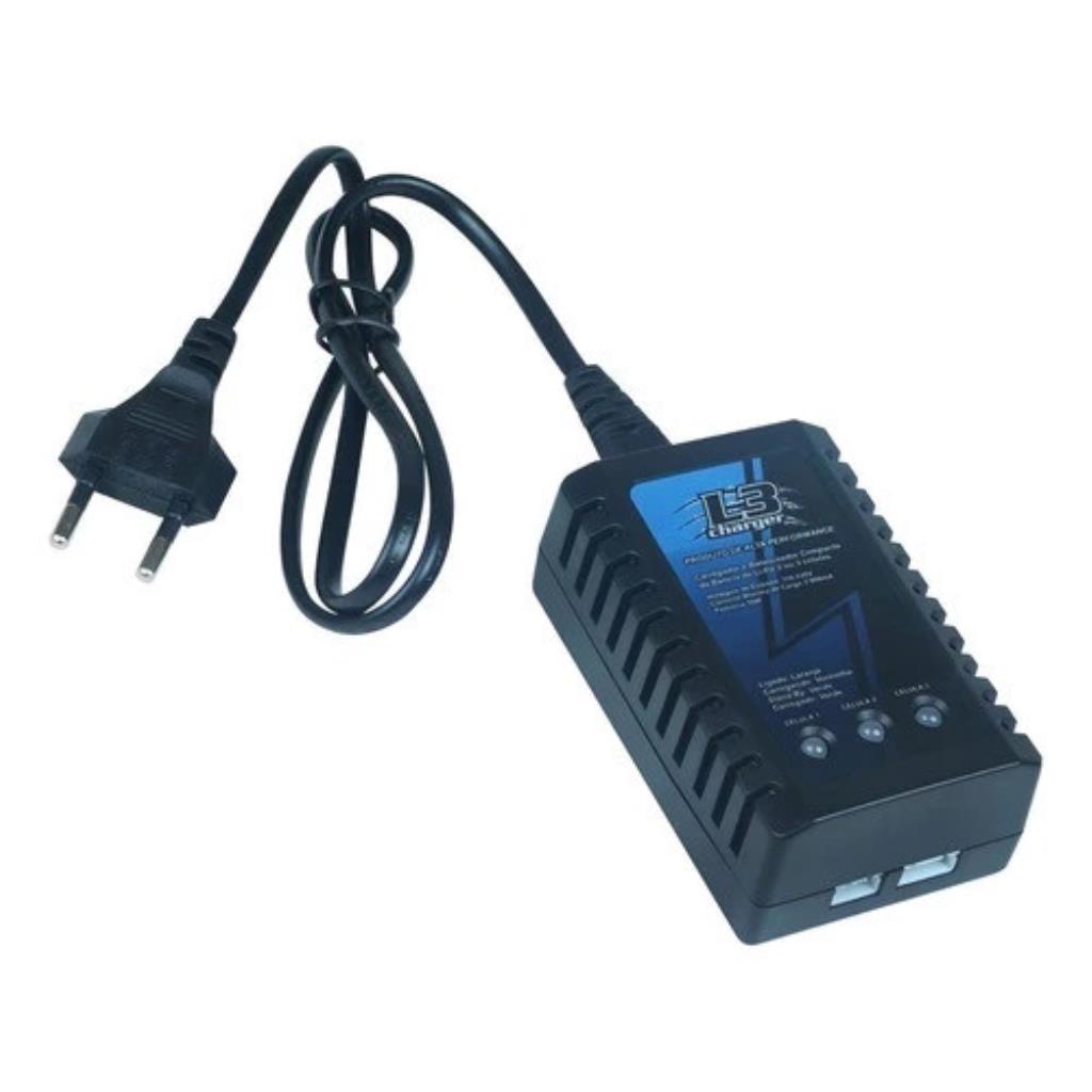 O carregador de bateria L3 da Leão é projetado para carregar baterias LiPo ou de polímero de lítio de 2 ou 3 células, requerendo um carregador específico para manter a integridade da bateria durante o carregamento.