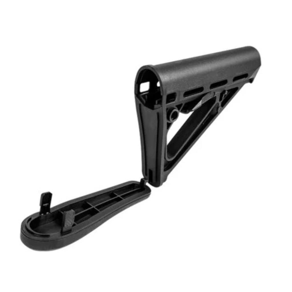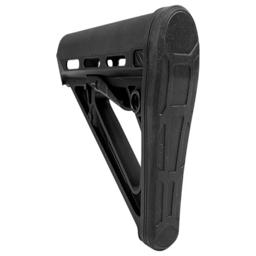 Como seu espaço interno é limitado, esta coronha é indicada para armas com bateria frontal ou com bateria que vá dentro do tube stock.