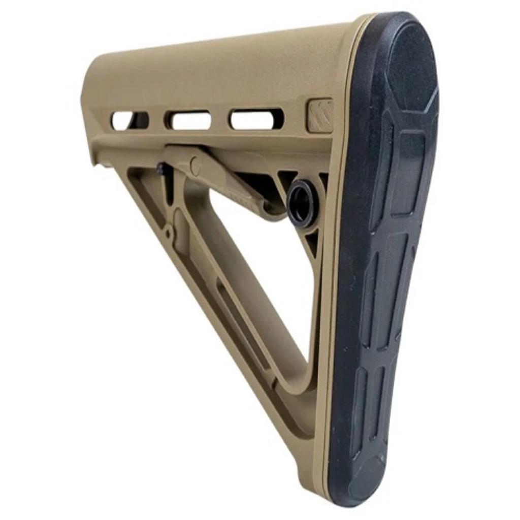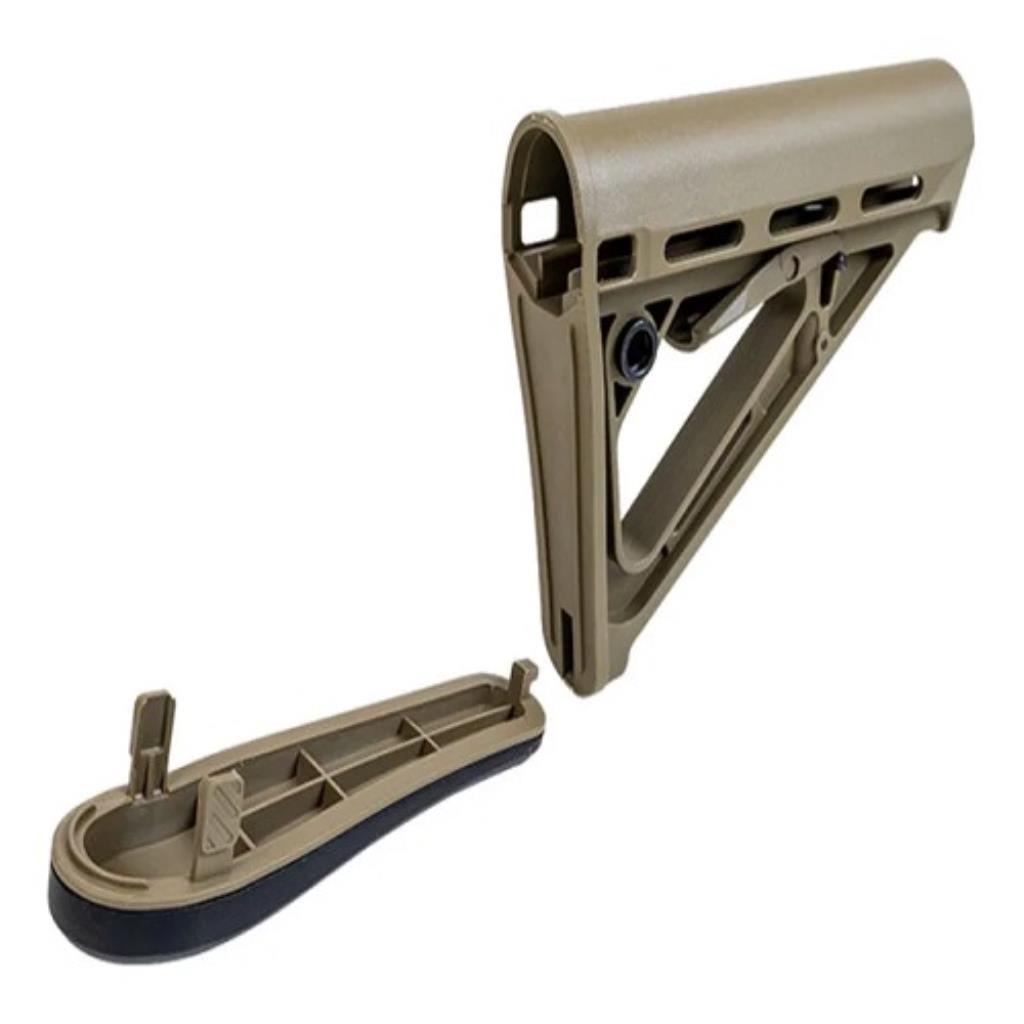 Como seu espaço interno é limitado, esta coronha é indicada para armas com bateria frontal ou com bateria que vá dentro do tube stock.